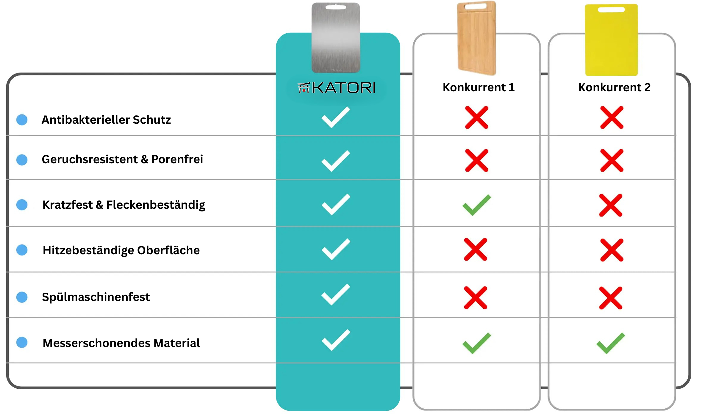 Katori wird mit TitaniumShield™-Technologie hergestellt und besitzt eine porenfreie, bakterienabweisende Oberfläche, die zu 100 % frei von Mikroplastik ist. Im Gegensatz zu Holz-, Plastik- oder Steinbrettern nimmt es keine Gerüche auf, verfärbt sich nicht und stumpft deine Messer nicht ab.A: